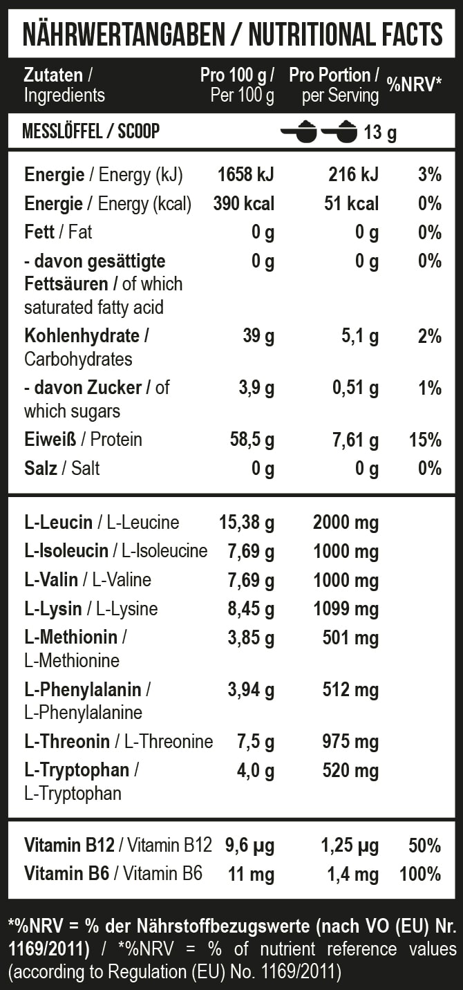 • 7,61 г амінокислот на порцію (ізолейцин, лейцин, валін, лізин, метіонін, треонін, триптофан та фенілаланін),