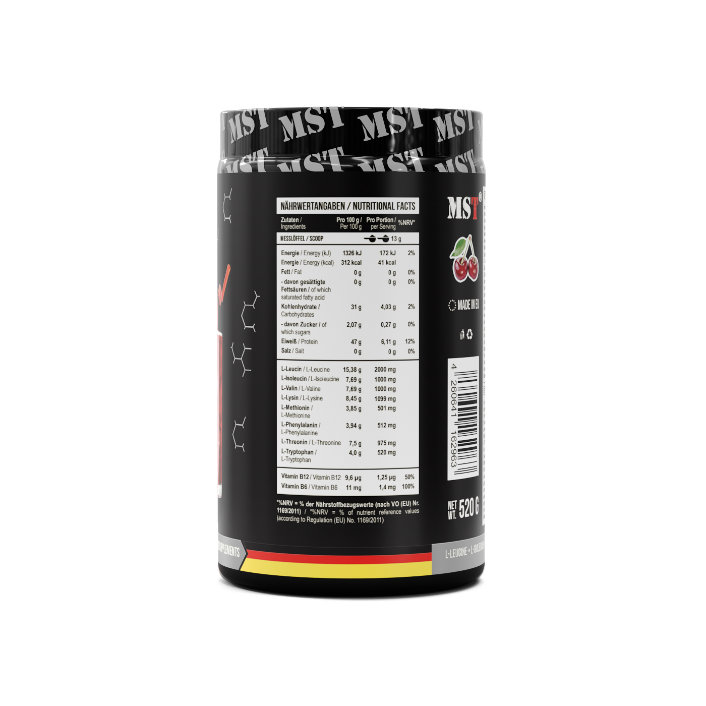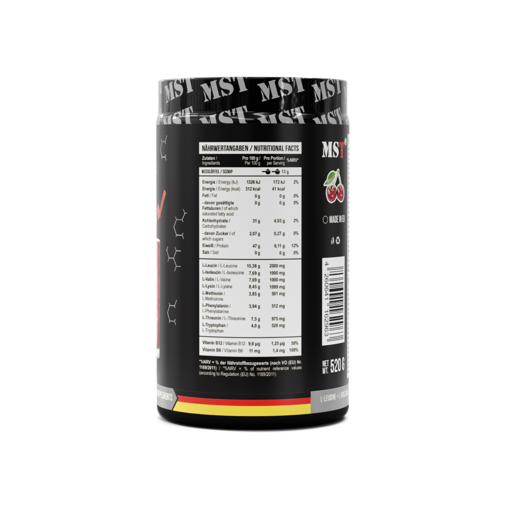 MST® BCAA&EAA Zero Вишня🍒40 порцій 520 грамів – це комплекс, що складається з 8 незамінних амінокислот, доповнений вітамінами групи В. Ці речовини представляють високу цінність для організму людини, оскільки вони не можуть самостійно синтезуватися в нашому тілі, а значить повинні надходити ззовні з їжею або ж при допомозі спеціальних дієтичних доповнень.