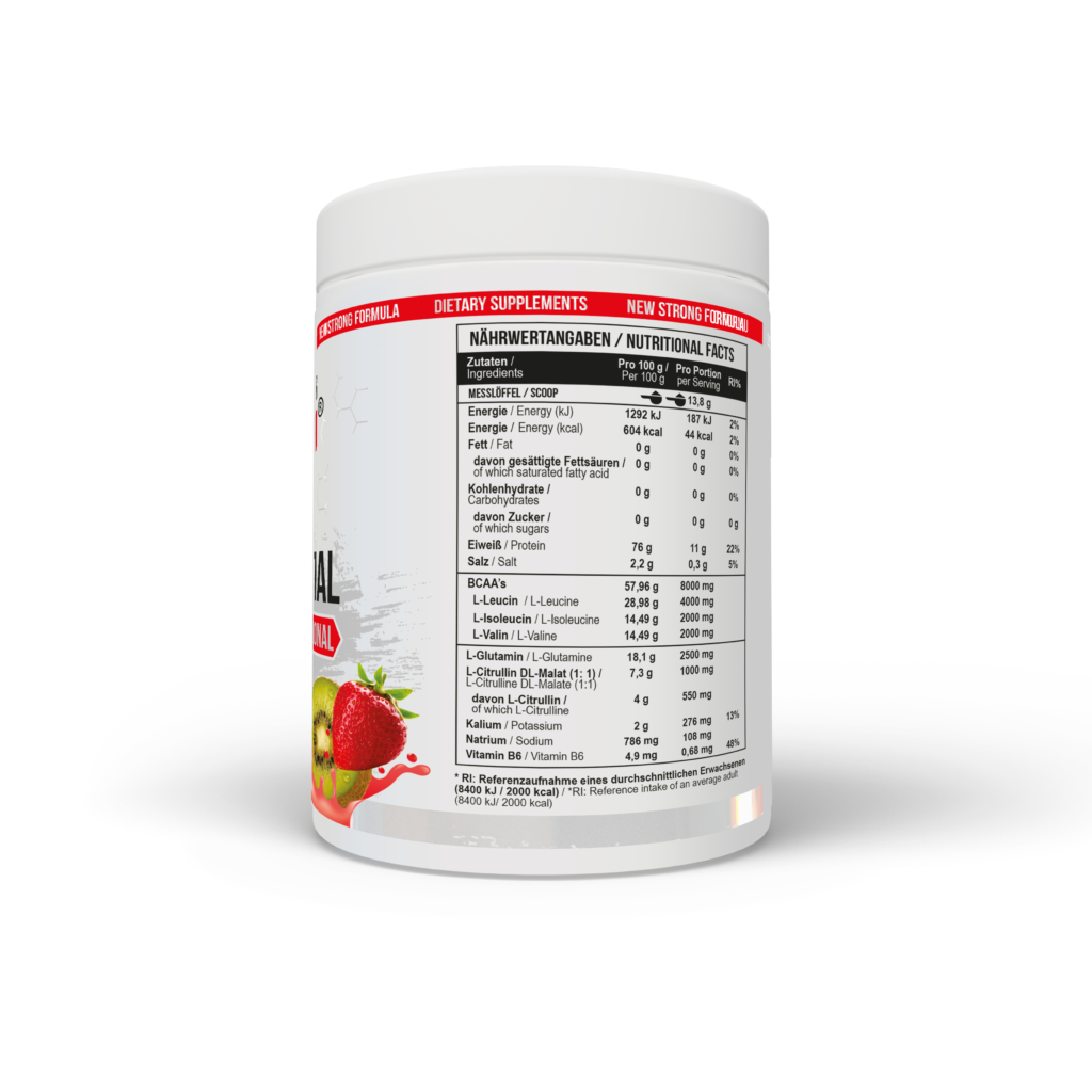 MST® BCAA Essential Fermented Professional Глютамін | Цитрулін | B6 — це комплекс незамінних амінокислот із розгалуженими ланцюгами (BCAA), доповнений амінокислотами для відновлення, такими як L-глютамін і L-цитрулін. Цей комплекс також збагачений вітаміном В6, калієм і натрієм, які підсилюють дію основних компонентів та підтримують організм після тренувань.