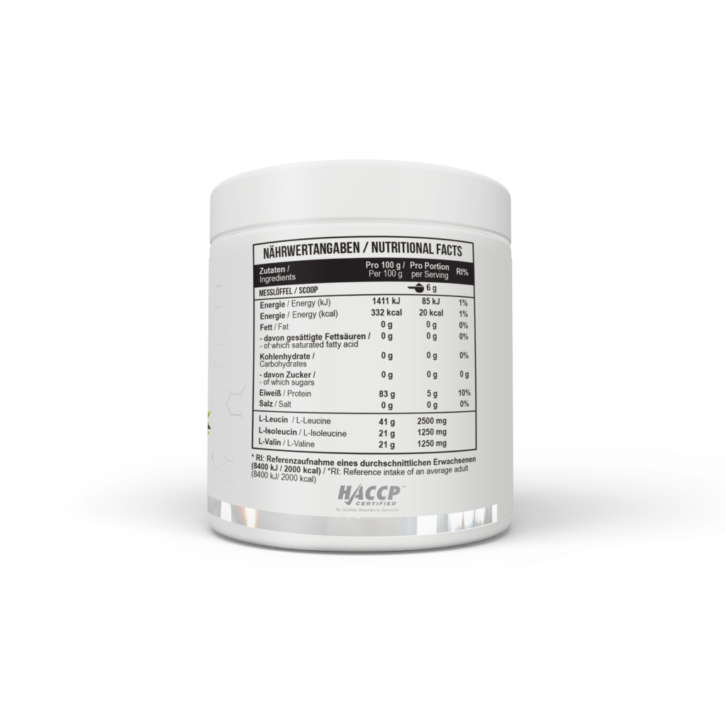 - У кожній порції міститься 5 грамів незамінних інстанізованих амінокислот ВСАА у співвідношенні 2:1:1, на 6 грамів порцію.