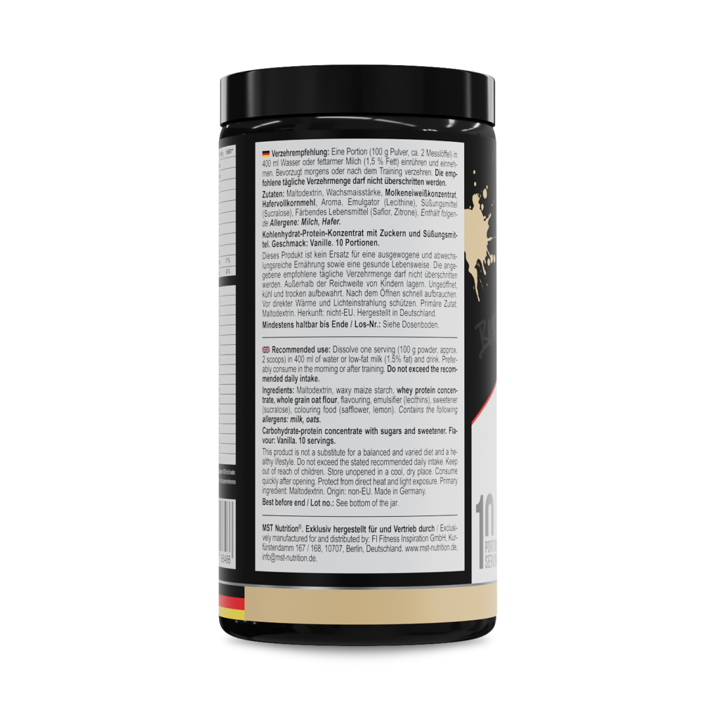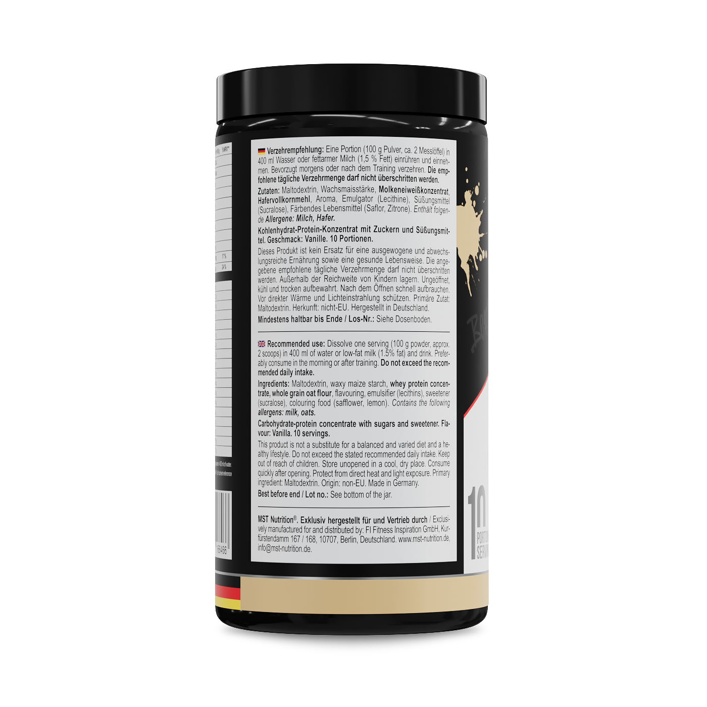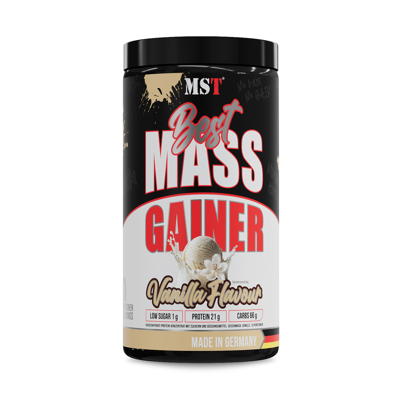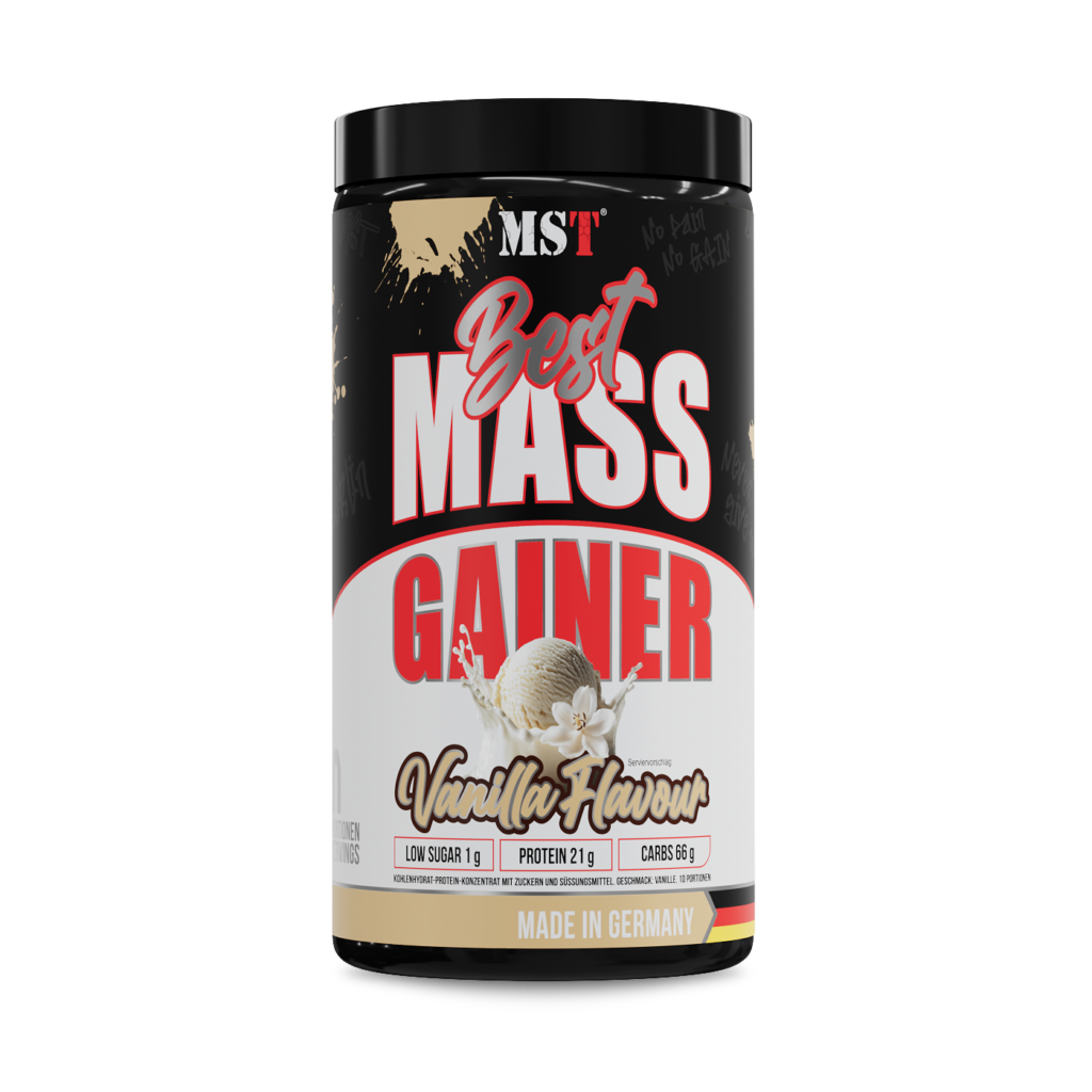 MST® BEST Mass Gainer Vanilla Гейнер Ваніль 10 порцій 1000 грамів – потужне джерело енергії та будівельного матеріалу для м’язового зростання. Містить в ідеальних пропорціях швидкорозчинний концентрат білка молочної сироватки і високоякісні вуглеводи.
