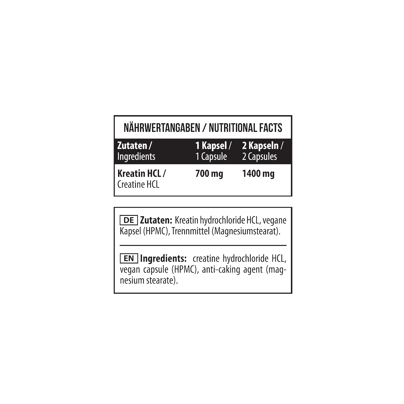 - 700 мг високоякісного креатину гідрохлориду в одній капсулі;