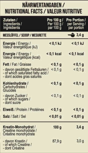 • 100% чистий мікронізований креатин моногідрат – без добавок, підсолоджувачів і ароматизаторів.