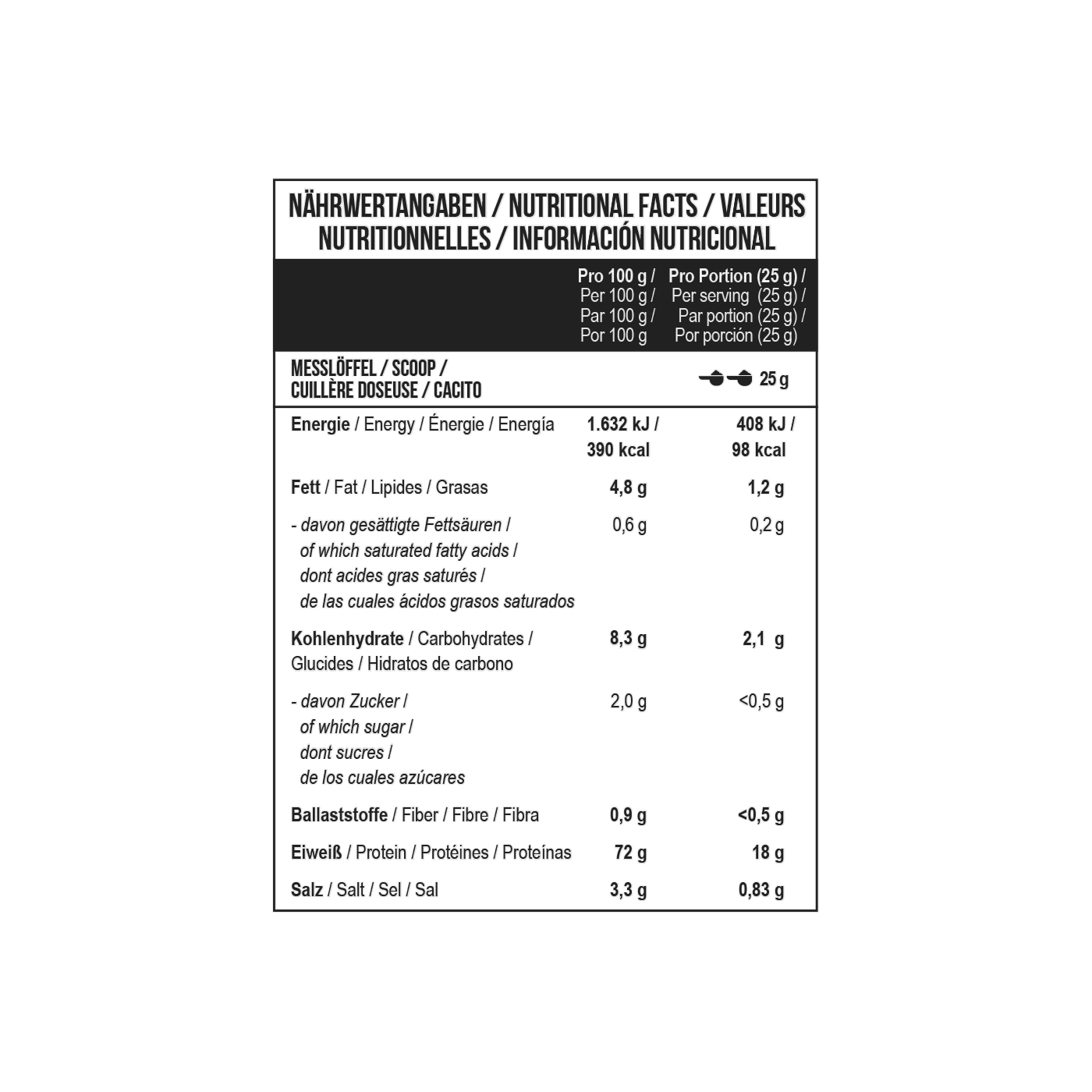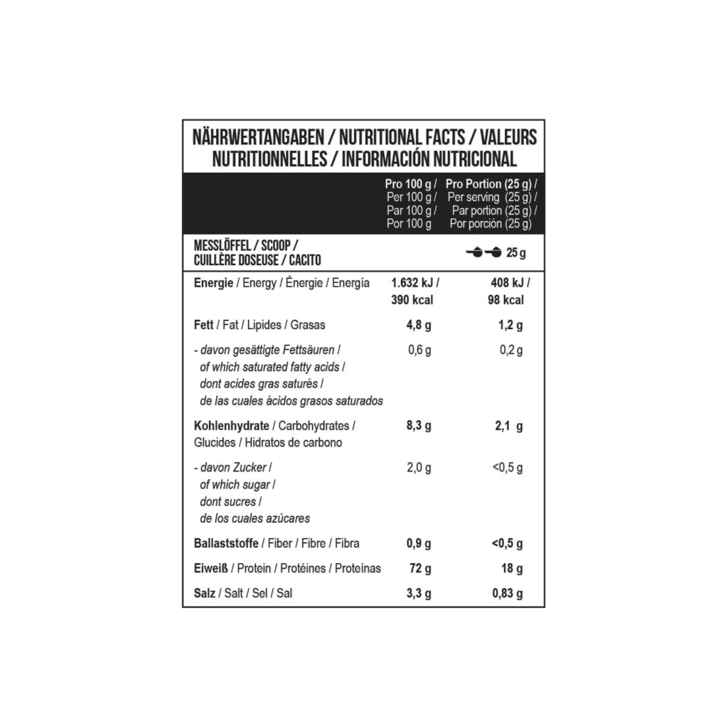У кожній порції міститься 18 g білка, що швидко засвоюється, і всього 98 kKal. Мінімум жирів та вуглеводів у складі, повністю відсутній цукор.