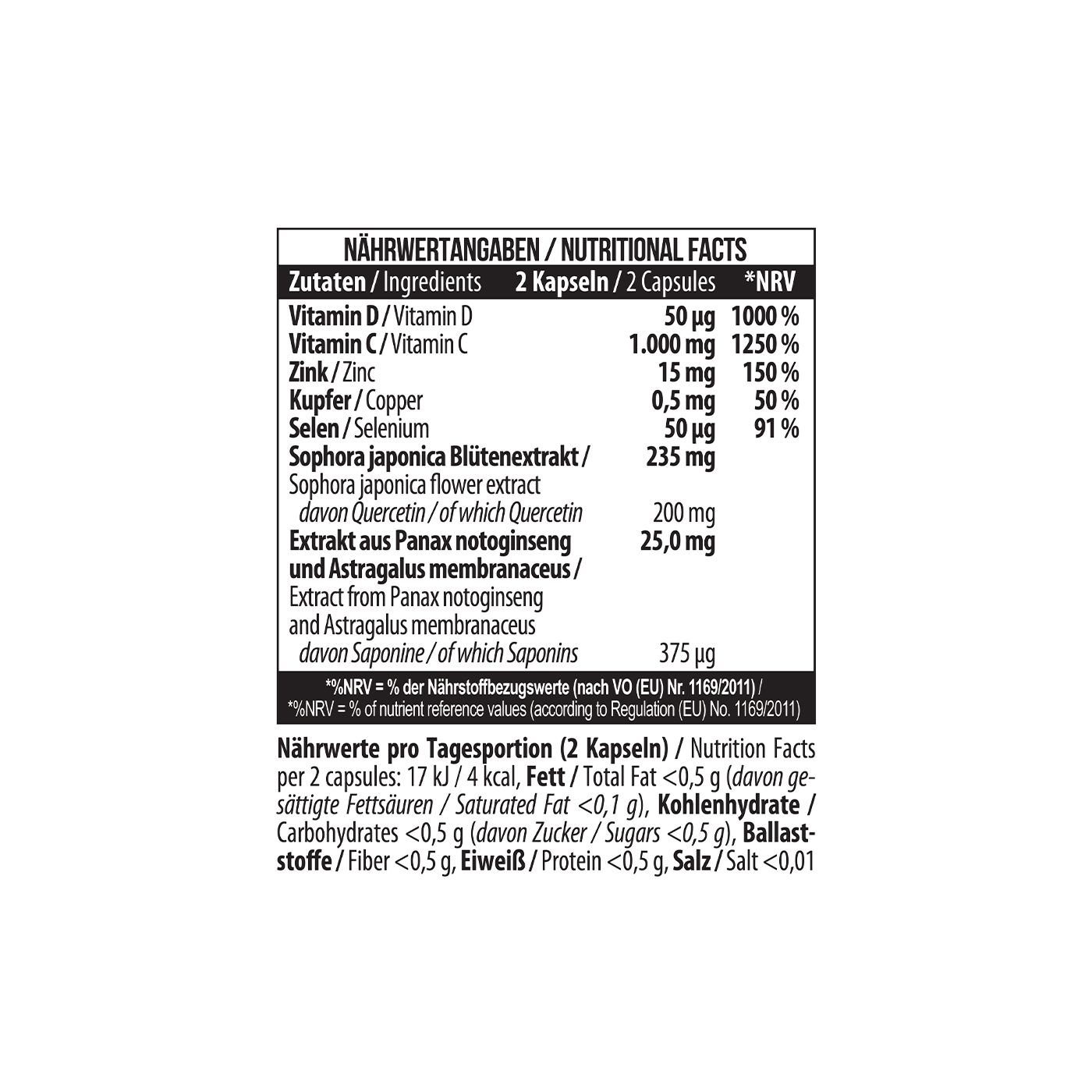 • Вітамін D3 (2000 МО / 50 мкг) — підтримує захист дихальної системи, активує Т-клітини.