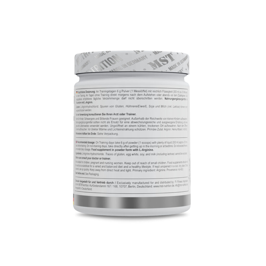 MST® L-Arginine HCL відповідає за вироблення гормону росту, підвищення рівня креатину в м’язах, прискорення жирового обміну, видалення токсинів з організму. Він збільшує кількість окису азоту – чим значно збільшує кровообіг, максимізує доставку кисню до кожної клітини організму. Аргінін є умовно незамінною кислотою, тому що він може синтезуватись в організмі людини. Однак організм не може зробити достатню кількість аргініну, і деяка його кількість має надходити з їжею або спортивним харчуванням.
