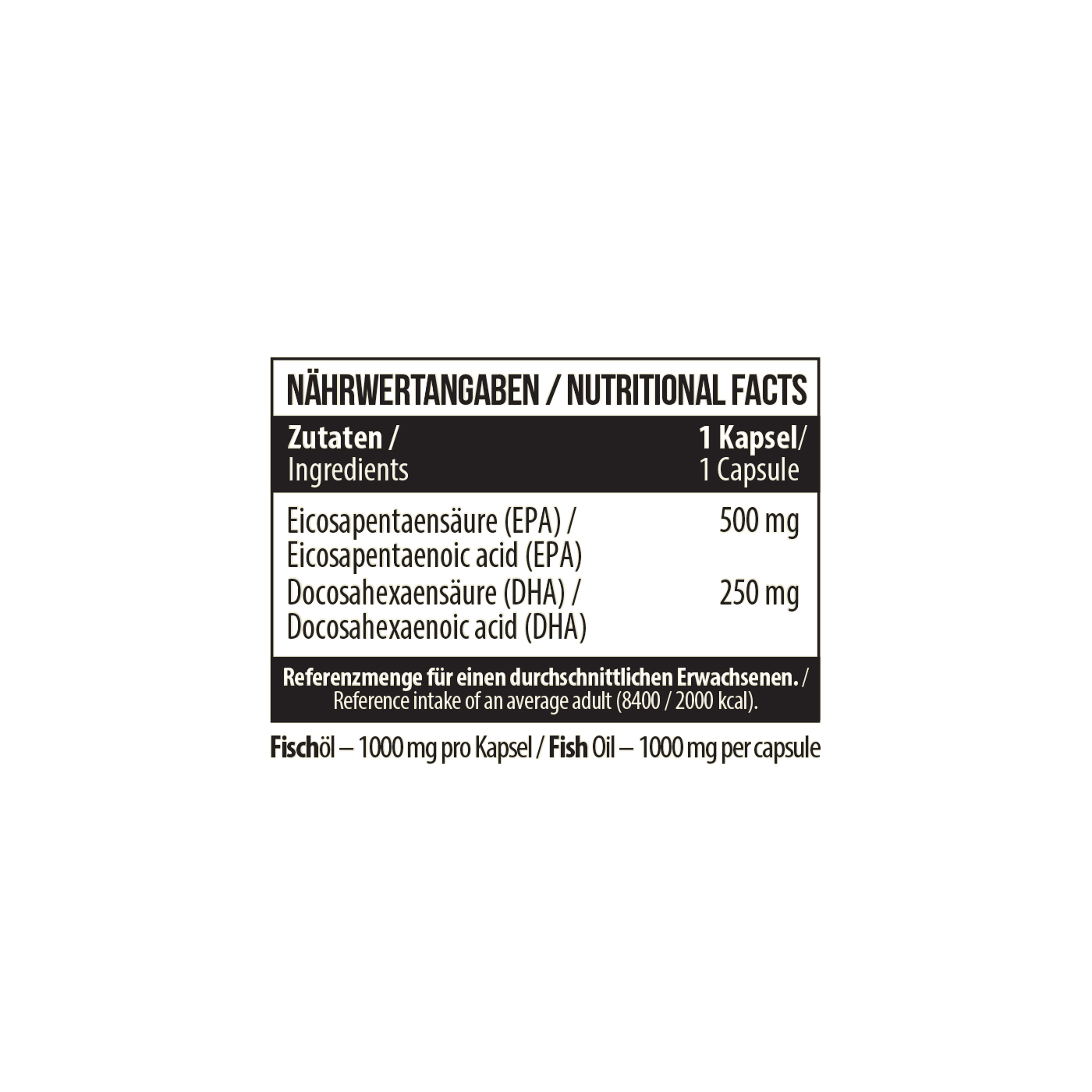 - Висока доза омега-3 жирів, вміст EPA і DHA в 1 капсулі досягає 750 мг (EPA 500 мг + DHA 250 мг), що дозволяє ефективно заповнювати нестачу Омега-3 в організмі людини (необхідний мінімум – 250-500 мг/день).