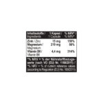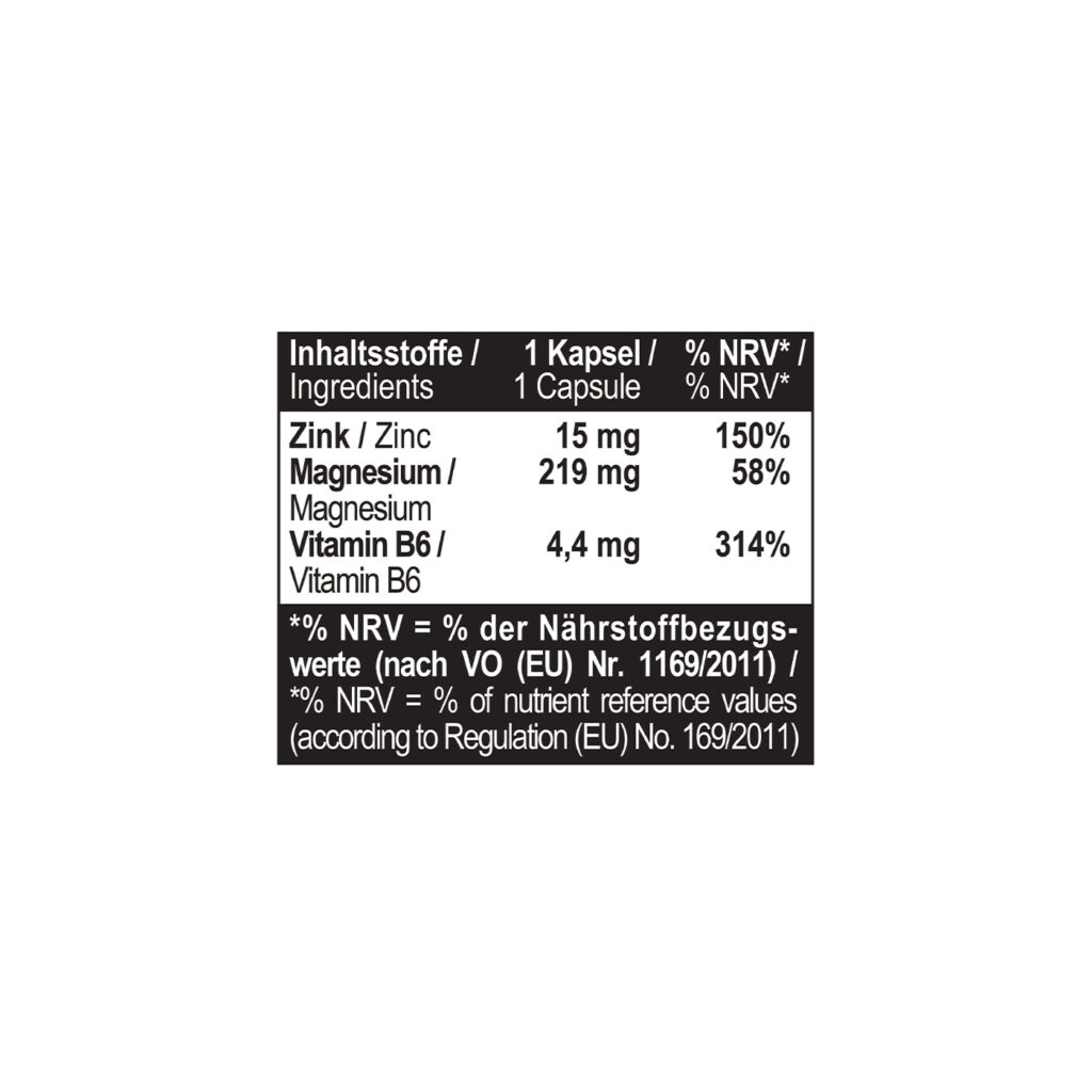 • Одна капсула містить 15 мг цинку глюконату, що становить 150% норми споживання (рекомендованої добової дози), 219 мг магнію (58%) і 4,4 мг вітаміну В6 (314%).