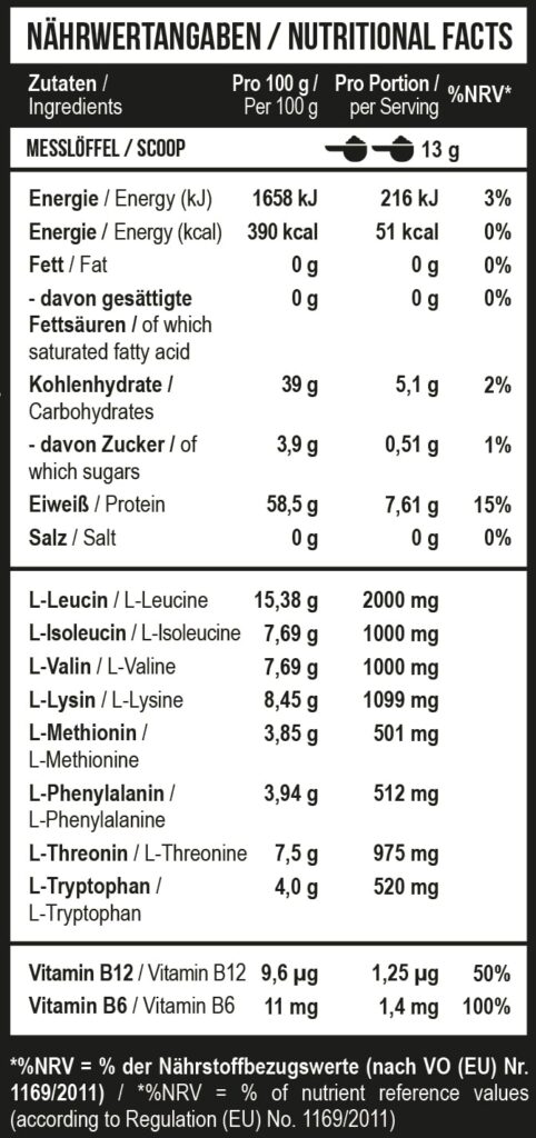 • 7,61 г аминокислот на порцию (изолейцин, лейцин, валин, лизин, метионин, треонин, триптофан и фенилаланин),