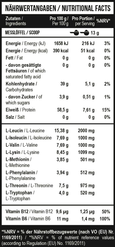 • 7,61 г аминокислот на порцию (изолейцин, лейцин, валин, лизин, метионин, треонин, триптофан и фенилаланин),