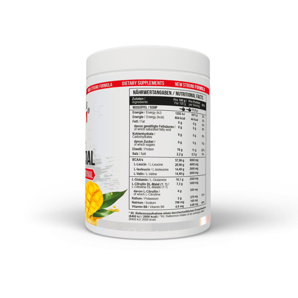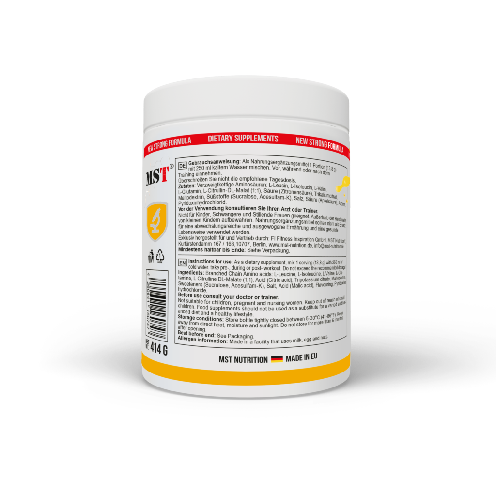MST® BCAA Essential Professional Fermented + Глютамин | Цитрулин | B6 | Манго🥭414 грамм представляют собой комплекс незаменимых аминокислот с разветвленной цепью, с добавлением аминокислот для регенерации — L-глютамина и L-Цитруллина. Дополнительно BCAA ESSENTIAL PROFESSIONAL обогащен витамином группы В – В6, калием и натрием, которые усиливают действие основных компонентов и поддерживают организм после тренировок.