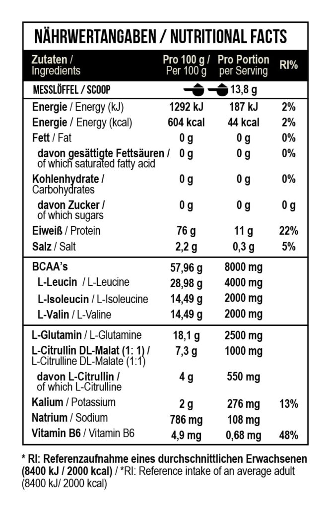 Аминокислоты с разветвленной цепью: L-лейцин, L-изолейцин, L-валин, L-глутамин, L-цитруллин DL-малат (1:1), кислота (лимонная кислота), трикалия цитрат, мальтодекстрин, подсластители (сукралоза, ацесульфам- к), соль, кислота (яблочная кислота), ароматизатор, пиридодоксин гидрохлорид.