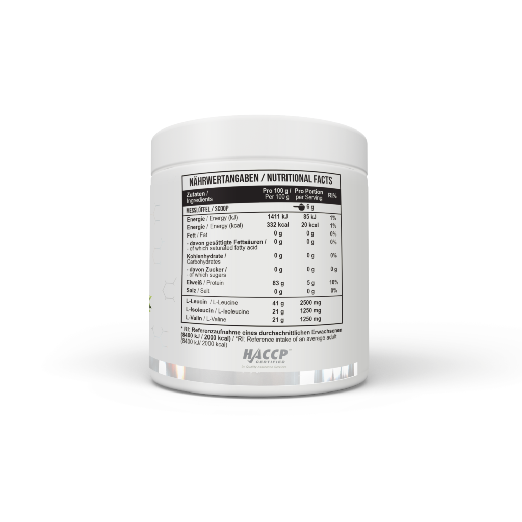 Аминокислоты с разветвленной цепью: Л-лейцин, Л-изолейцин, Л-валин в соотношении 2:1:1, кислота (лимонная кислота), ароматизатор, подсластитель (сукралоза), эмульгатор (соевый лецитин).