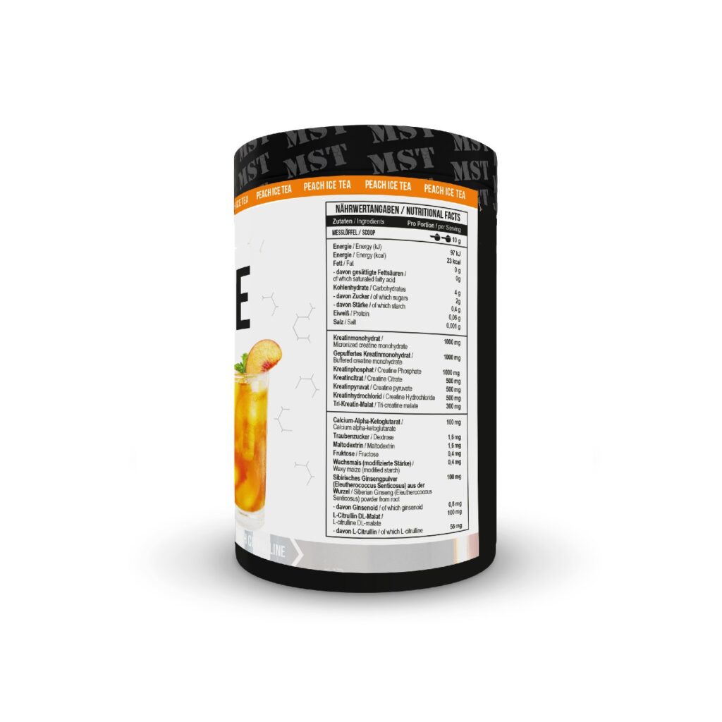 Декстроза, мальтодекстрин, креатин фосфат, буферизованный моногидрат креатина, микронизированный моногидрат креатина, креатин цитрат, пируват креатина, гидрохлорид креатина, ароматизаторы, фруктоза, восковая кукуруза (модифицированный крахмал), трикреатин малат, лимонная кислота, (сукралоза), альфа-кетоглутарат кальция, сибирский женьшень (элеутерококк сентикозус) порошок из корня, Л-цитруллин ДЛ-малат.