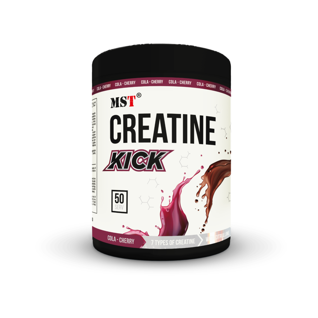 MST® Creatine Kick Креатин Кик 7в1 Кола-Вишня 50 порций 500 грамм – это многокомпонентный быстро усвояемый креатин в инновационной формуле, объединяет несколько видов креатина в одном продукте. Он соединяет свойства и преимущества различных видов креатина в одну смесь. Содержит 7 видов креатина. Для продуктивной тренировки мышцам нужен не только белок, но и хорошее энергообеспечение. Креатин — главная добавка для этого с доказательной базой. Также креатин эффективен для набора мышечной массы за счёт эффекта гидратации. Благодаря этому мышцы не только становятся сильнее, но и выглядят более наполненными.