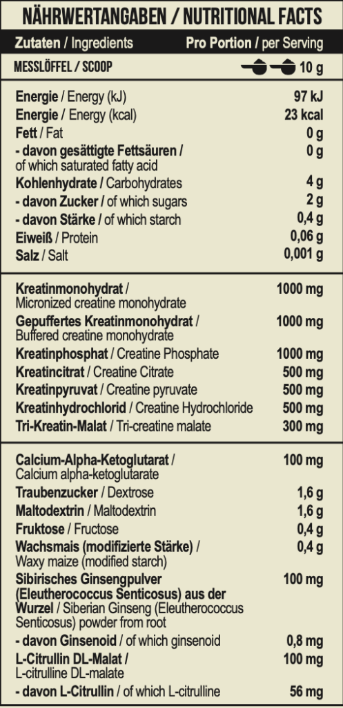 Декстроза, мальтодекстрин, креатин фосфат, буферизованный креатин моногидрат, микронизированный моногидрат креатина, креатин цитрат, пируват креатина, гидрохлорид креатина, ароматизаторы, фруктоза, восковая кукуруза (модифицированный крахмал), трикреатин малат, лимонная кислота, (сукралоза), альфа-кетоглутарат кальция, сибирский женьшень (элеутерококк сентикозус) порошок из корня, Л-цитруллин ДЛ-малат.
