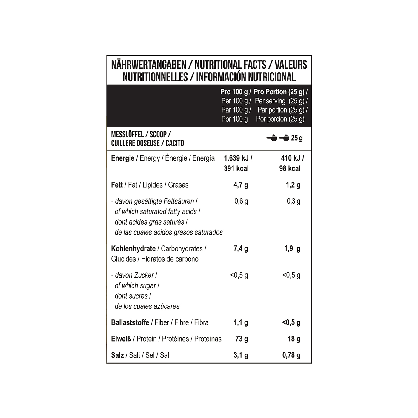 В каждой порции содержится 18 g быстроусвояемого белка и всего 98 kKal. Минимум жиров и углеводов в составе, полностью отсутствует сахар.