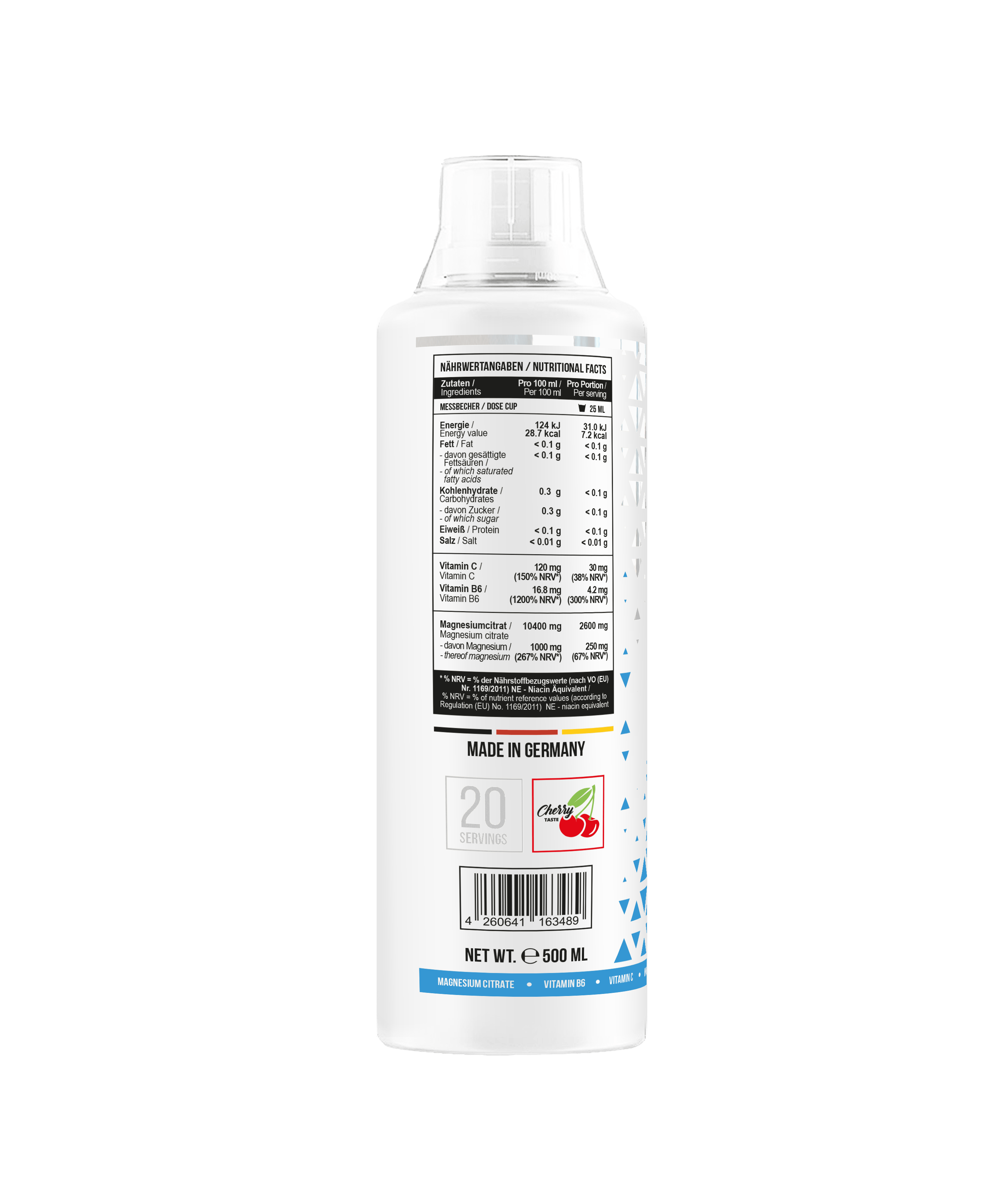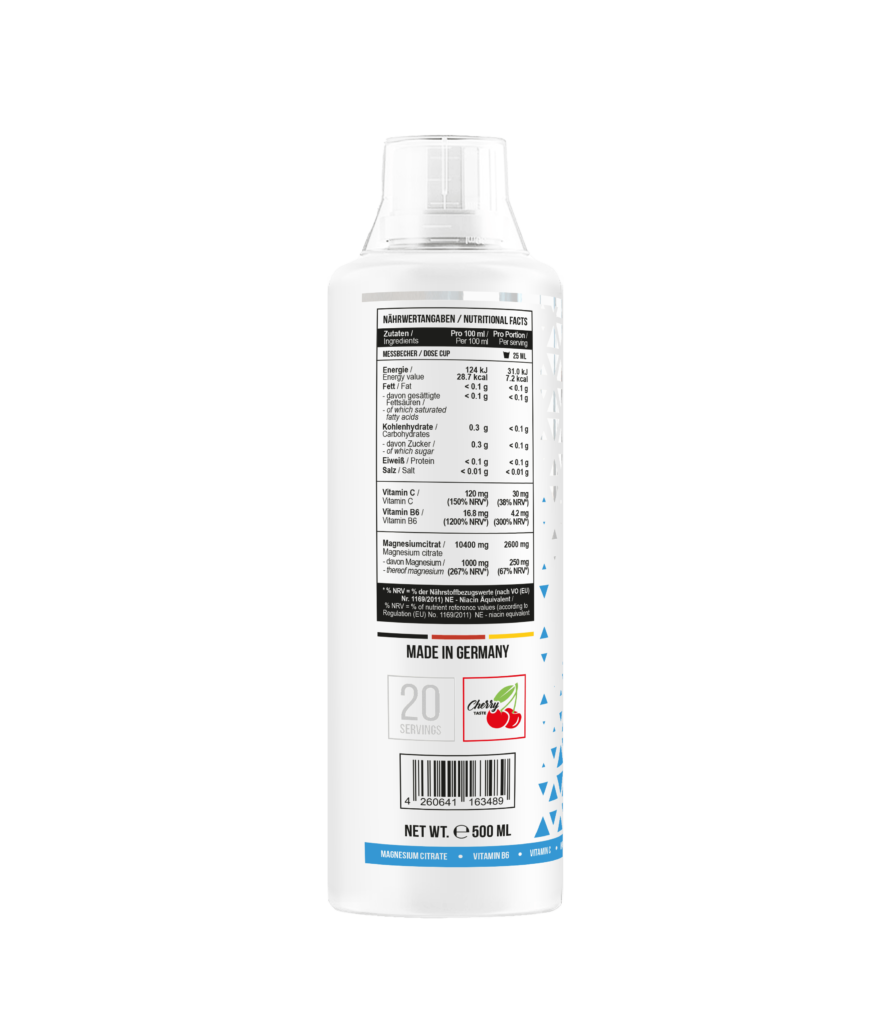 Состав: вода, цитрат магния, ароматизатор, кислота (молочная кислота), L-аскорбиновая кислота, порошок вишни (0,35%), консервант (сорбат калия), подсластитель (цикламат натрия, ацесульфам К, сахарин), пиридоксина гидрохлориды.