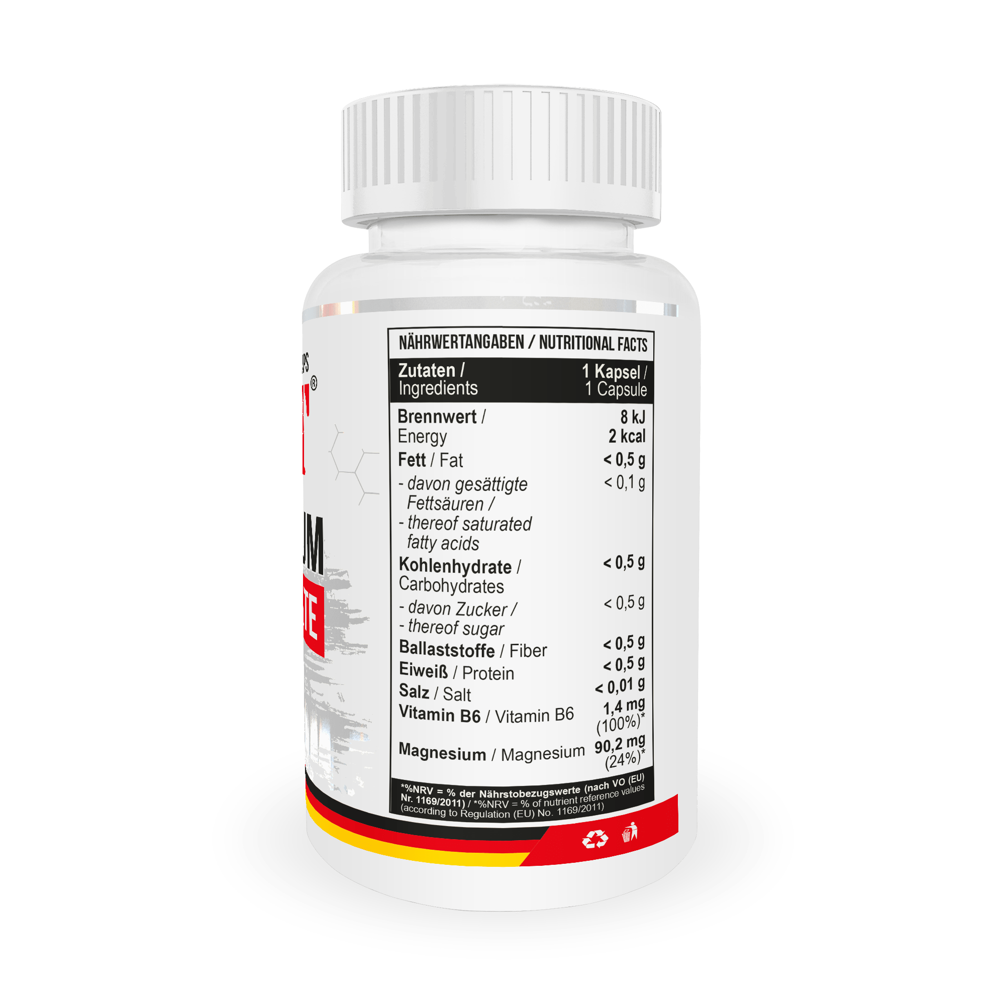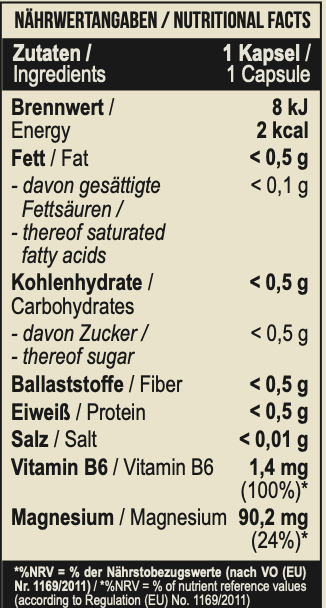 Состав: бисглицинат магния, гидроксипропилметилцеллюлоза, антислеживатель (магниевые соли жирных кислот), пиридоксина гидрохлорид.