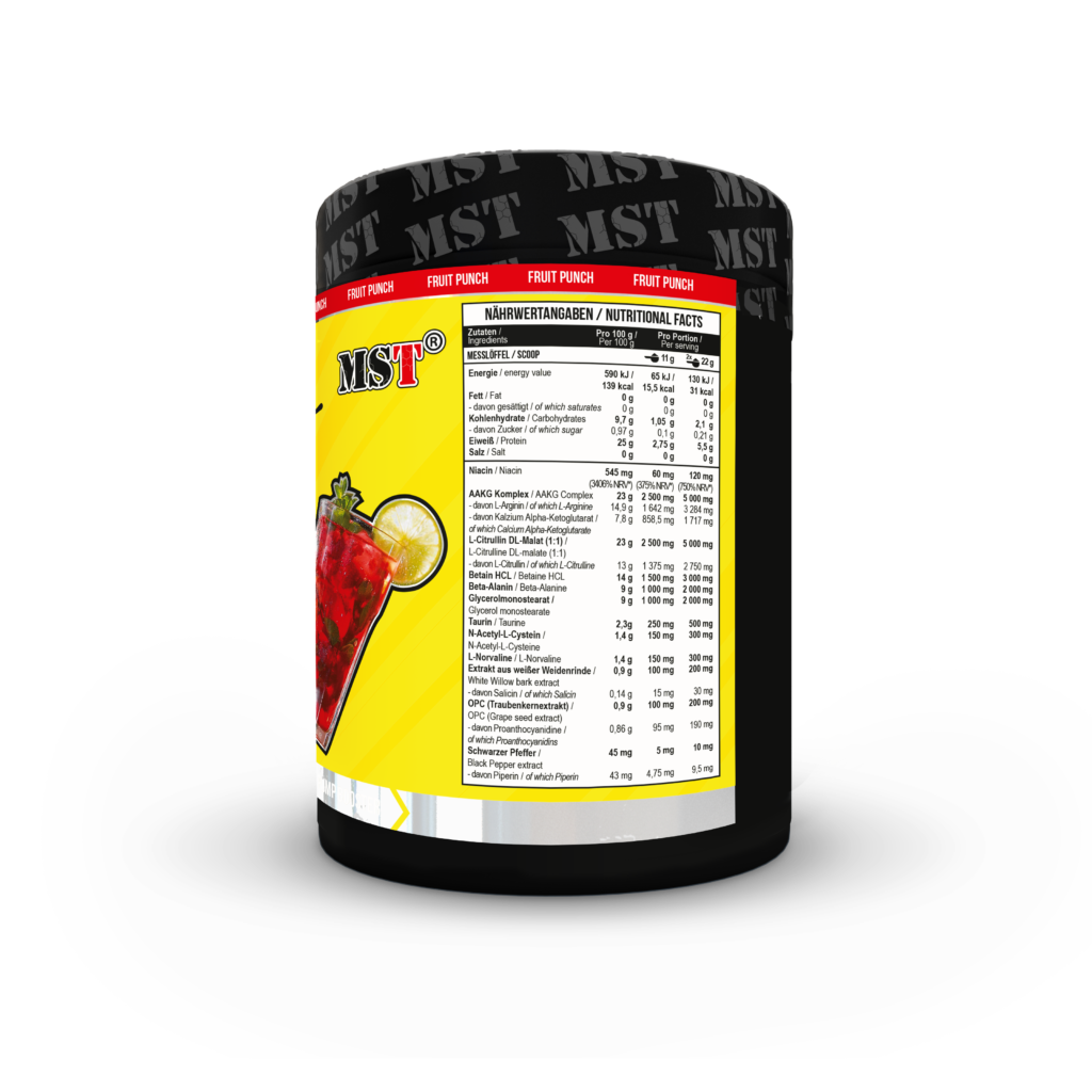 Комплекс ААКГ (л-аргинин, альфа-кетоглутарат кальция), дл-малат л-цитрулина (1:1), бетаин гидрохлорид, моностеарат глицерина, бета-аланин, мальтодекстрин, кислота (лимонная кислота), таурин, ароматизаторы, веществ диоксид кремния, кальциевая соль ортофосфорной кислоты), н-ацетил-л-цистеин, л-норвалин, опс — экстракт виноградных косточек 120:1 (Vitis vinifera), стандартизированный до 95% Проантоцианидина, экстракт кори L.), стандартизированный салицина, подсластителей (сукралоза, ацесульфам-k), ниацина, экстракта плодов черного перца.35:1 (Piper Nigrum) стандартизирован до 95% пиперина.