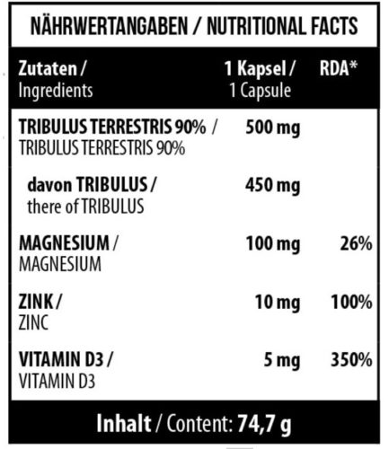 • каждая капсула содержит 500 мг чистого высококачественного экстракта плодов Трибулус Террестрис;
